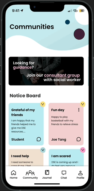 Emotional Diary App encourages students to record their thoughts and emotions daily, allowing for tracking of their emotional flow and providing suggestions for those in need. It also serves as a community platform for anonymous sharing and support, with professionals includes social workers, counsellors, etc. that are actively participating.