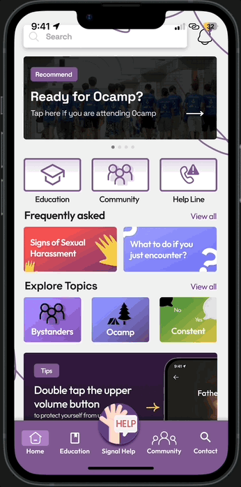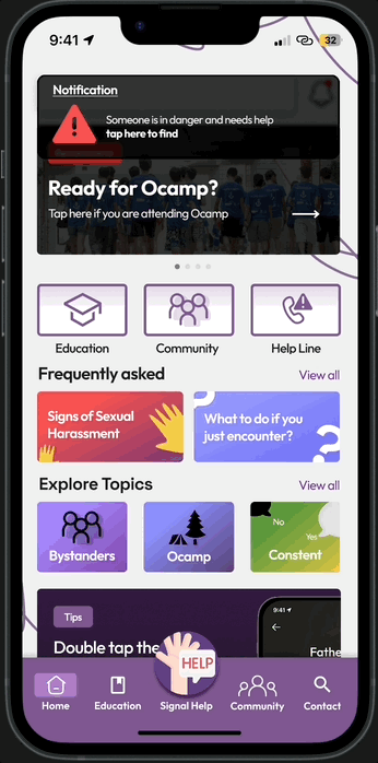 In late 2023, I decided to focus my final-year capstone project on this topic, aiming to raise awareness and exploring potential interventions for prevention from this happening. I designed a concept education and prevention app that is specifically designed to protect university students from sexual harassment, both on and off-campus.